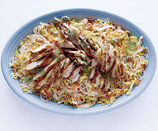 Meanwhile, prepare the noodles according to package directions. Drain, rinse briefly under cold running water, and transfer to the large bowl. Add the cabbage and sesame oil, toss well, and season to taste with salt, pepper, and more sesame oil. Transfer the salad to a serving platter or plates. Slice the chicken thinly and arrange on top. Drizzle with the reserved dressing, garnish with fennel fronds, and serve.
