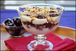 In a mid-sized glass, layer half of each ingredient: yogurt, cherry mixture, and oat mixture. Continue layering with remaining ingredients and enjoy!