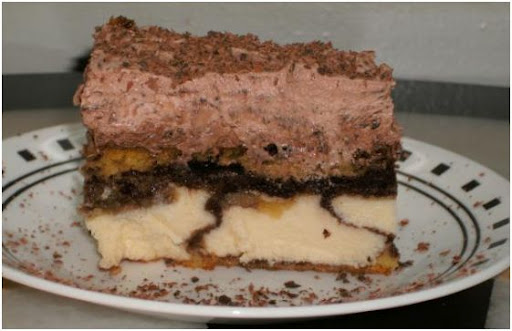 A luscious combination marble cake and cheese cake with a creamy chocolate topping. It tastes like a chocolate eclair