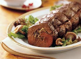 Heat oven to 425°F. To cut beef so that it can be filled and rolled, cut horizontally down length of beef, about 1/2 inch from top of beef, to within 1/2 inch of opposite side; open flat. Turn beef. Repeat with other side of beef, cutting from the inside edge to within 1/2 inch of opposite edge; open flat.