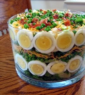 Layer ingredients in a bowl in the order above. Spread mayo over top. Sprinkle with cheese.(This can be made the day before). Mix when ready to serve.