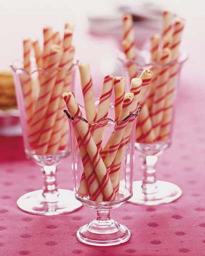 The candy-stripe cookie sticks should not be stored in the freezer; they're too delicate and freezing them will make them lose their crispness.