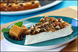 Once cheesecake has completely cooled, evenly top with crushed graham crackers. Drizzle with caramel dip and sprinkle with pecans.