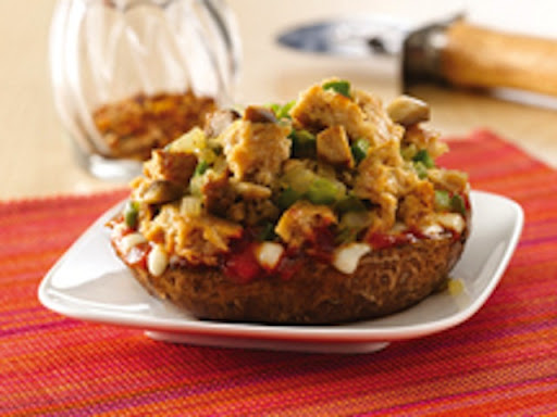 • Blot away excess moisture from mushroom caps. Spread with pizza sauce, sprinkle with shredded string cheese, and top with cooked veggies and sausage.