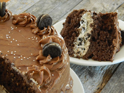 Remove your cakes from the baking pans after they have cooled. If wanted you can level your cakes after they have baked and cooled. Lay one of the cakes on the cake platter and spread the entire OREO filling over the top ot the cake. Being careful not to rip or tear the cake. Level the next cake and place that on top of the OREO filling. Frost the entire cake with icing.