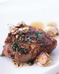 Add the water, lemon juice, parsley and crushed red pepper to the pan and cook, scraping up any browned bits stuck to the bottom, until sizzling, about 1 minute. Pour the garlic and pan sauce over the lamb chops and serve immediately.