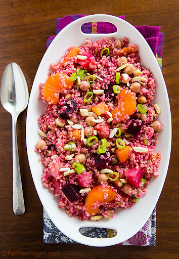 Dice the beets. Add them and the clementines, green onions, and almonds to the quinoa.