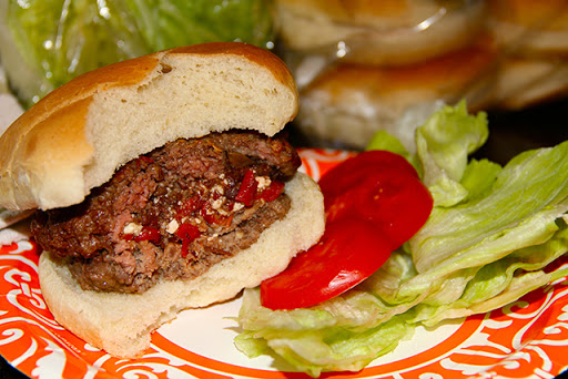 Once the top of the press has been removed, layer the interior of the burger with olive tapenade, then feta cheese and last with red pepper.