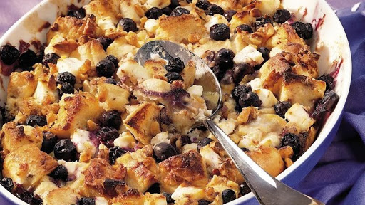 Pour bread mixture into casserole. Top evenly with cream cheese, blueberries and nuts. Cover and refrigerate at least 1 hour but no longer than 24 hours.