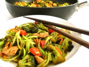Sounds pretty basic but this Asian style stir-fry tastes amazingly delicious! I can’t wait for you to try it. The ginger, garlic and red pepper flakes add a little kick. Each serving has 9 grams of fiber since this dish is loaded with broccoli, broccoli slaw and a variety of other vegetables. No noodles needed. The broccoli slaw mimics the texture of noodles. In fact, no rice needed either. One huge 2 cup serving has 271 calories, 7 grams of fat and 7 Weight Watchers POINTS PLUS.