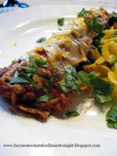 Divide meat mixture evenly among tortillas; roll up. Place into greased 9×13 pan, seam-side down. Cover with remaining sauce. Sprinkle with cheeses.