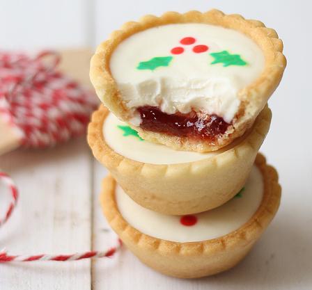 Place 1 teaspoon strawberry jam on every cookie bowl. Fill with cheese cream. Use wooden skewers and red and green mixes to decorate