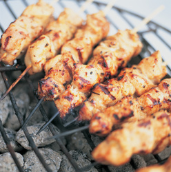 Preheat grill to high setting. Thread chicken pieces onto metal skewers and discard remaining marinade. Coat grill with cooking spray or brush lightly with oil.