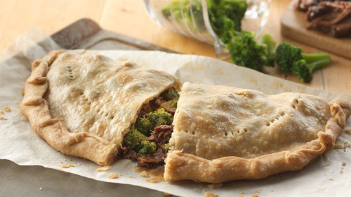 4 Use slotted spoon to place half of the filling onto half of each of the pie crusts. Fold remaining halves over filling. Discard excess liquid in pan. Pinch and fold over edges to seal. Pierce surface of each calzone 6 to 7 times along the seamed edge to let steam escape.