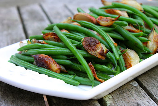 7. Toss in the roasted shallots and blanched beans, tossing until thoroughly coated with the oil.