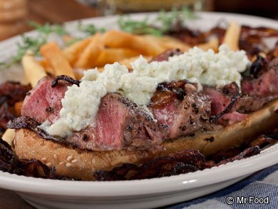 Press peppercorns into both sides of steaks. In the skillet or on a griddle pan, melt remaining butter over medium-high heat. Add steaks and cook 5 to 6 minutes per side for medium doneness. Slice steaks across the grain and distribute evenly on hoagie roll halves. Top with onions and blue cheese mixture; serve immediately.