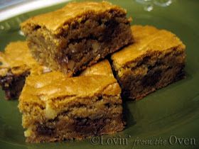 butter mixture, beating well. Stir in chocolate morsels and pecans; spoon into a greased 13x9x2 inch baking pan.