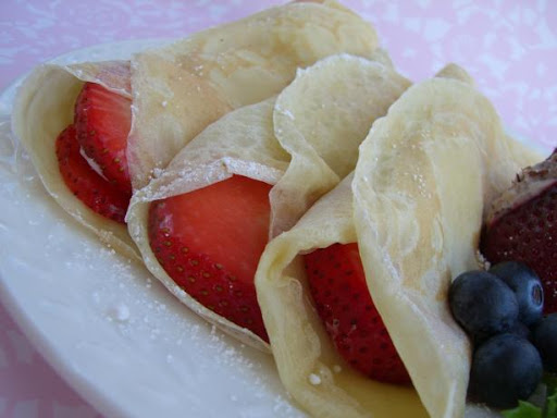 1 Combine flour, milk, eggs, and oil. 2 Add salt. 3 Heat a lightly greased 6 inch skillet; remove from heat. 4 Spoon in 2 Tbsp batter; lift and tilt skillet to spread evenly. 5 Return to heat; brown on one side only. 6 To remove, invert pan over paper toweling. 7 Repeat with remaining batter. 8 Fill with your favorite filling. 9 Here's a few we like: Any flavor fruit jam, sweetened fresh peaches, cream cheese and pineapple, ham and maple syrup. 10 Endless ideas.
