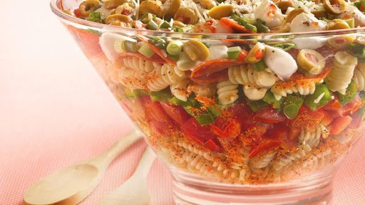 2 In 3- or 4-quart clear bowl, layer 4 cups pasta, 1 tablespoon of the seasoning, the red bell pepper, tomatoes, green bell pepper, remaining pasta, remaining 1 tablespoon seasoning, the pepperoni, mozzarella, onions and olives.