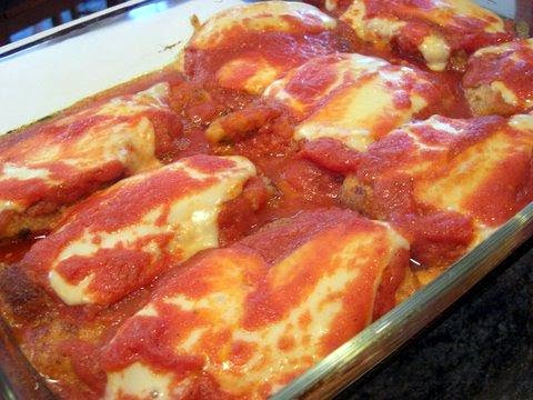 Spread some sauce in the bottom of your baking pan. Place chicken cutlets on top. Sprinkle some freshly grated cheese on top of that. Now add another layer of sauce. Add slices of mozzarella cheese. Add more sauce.