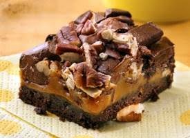3. Pour caramel over partially baked brownie; spread to edges. Sprinkle with 1 cup of the chocolate chunks and 1/2 cup of the pecans. Drop remaining brownie batter by small spoonfuls onto caramel layer. Sprinkle with remaining 1 cup chocolate chunks and 1/2 cup pecans.