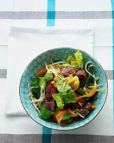 7. With a vegetable peeler, cut carrots into long ribbons. Add to steak in bowl, along with lettuce and mint; toss to combine.