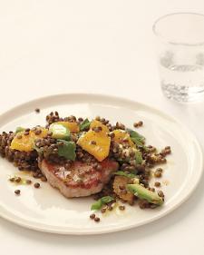 Pork with Lentil, Orange, Avocado, and Basil Salad