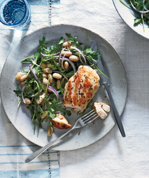 Heat the remaining tablespoon of oil in a large skillet over medium heat. Remove the chicken from the marinade (discard the marinade) and cook until cooked through, 6 to 8 minutes per side. Serve the chicken with the arugula and beans.