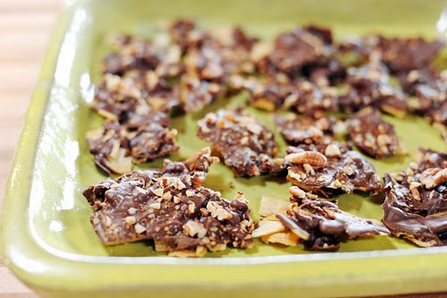 To assemble, spread pita chips in a single layer on top of waxed paper. Pour half the melted chocolate over the top, distributing as evenly as possible. Sprinkle half the toasted pecans over the top. Repeat with the rest of the chocolate and the rest of the pecans. Allow to sit at room temperature to harden, or place in the freezer for ten minutes to speed the process along. Crack apart with a fork and place on a serving platter.