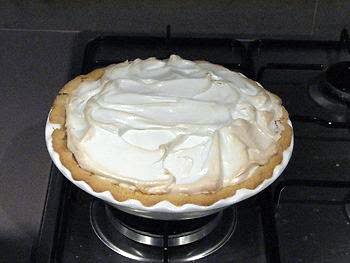 ********* Spread cold filling mixture into pastry case, top with the meringue, spread it all the way to the sides of pie to make a seal; bake in moderate oven 5 to 10 minutes until light golden brown