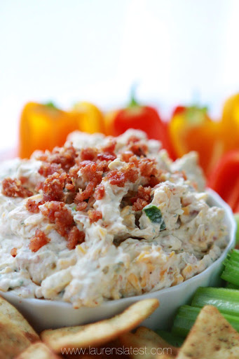Stir cream cheese, sour cream, ranch dressing and green onions together to combine. You just want to disperse the powdered ranch throughout the mixture and incorporate that cream cheese. Stir in the remaining ingredients and serve with veggies and crackers.