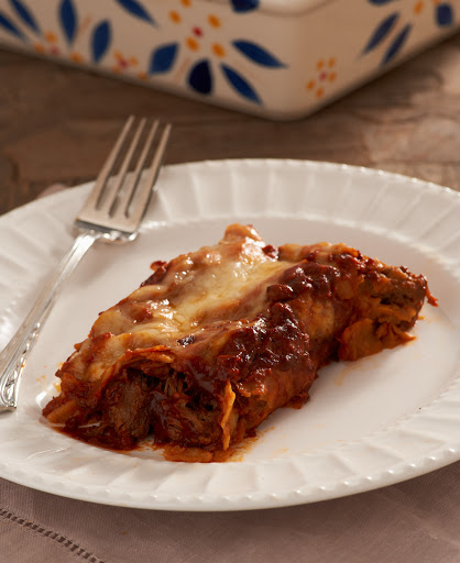 Shred the beef with 2 forks and then fold in the reduced liquid and 1/4 cup of the enchilada sauce. Spread 1 cup of the enchilada sauce over the bottom of a 9” x 13” baking dish. Spread a little less than 1/4 cup of the meat down the middle of one corn tortilla. Spread 1 Tbsp of the cheese on top of the meat. Roll the tortilla around the meat and place, seam-side down, into the baking dish. Repeat with the remaining tortillas, meat, and cheese.