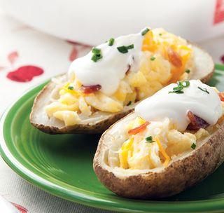 Bake potatoes at 400 degrees for one hour, until tender. Slice potatoes in half lengthwise; scoop out centers and reserve for another recipe. Place potato skins on a lightly greased baking sheet. Bake at 400 degrees for 6 to 8 minutes, until crisp. In a skillet over medium heat, scramble eggs in butter just until they begin to set. Add salt and pepper; remove from heat. Spoon equal amounts of eggs, cheeses and bacon into each potato skin. Reduce heat to 350 degrees and bake for 7 to 10 minutes, until cheese is melted and eggs are completely set. Garnish with sour cream and chives.