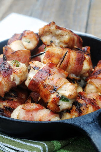 First: Dab 1/2 teaspoon (more or less) of cream cheese on top of each chicken tender. Sprinkle a scant 1/4 teaspoon of peppers over cream cheese. Fold or roll chicken to enclose cream cheese mixture. Wrap each roll with one piece of bacon and secure with a toothpick.