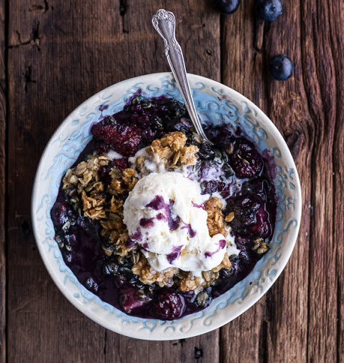 In a medium size bowl add the oats, flour, brown sugar (1/2 cup), baking soda, cinnamon and salt. Add the softened butter and use your fingers to crumble it into the oats mixture until everything is moist and the butter is evenly distributed. Sprinkle the crisp over the berries. Bake for 25-30 minutes, until crisp is golden brown and the fruit is bubbling up and smells amazing.