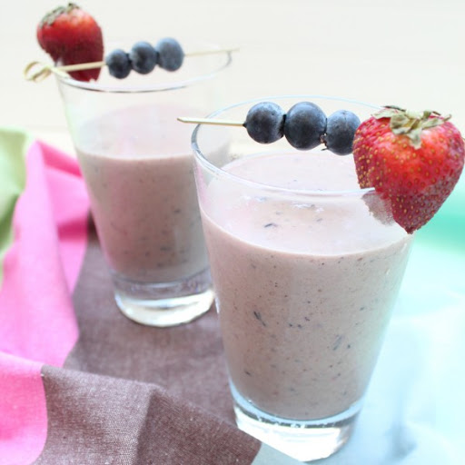 Begin by adding the strawberries, blueberries and banana to a blender.