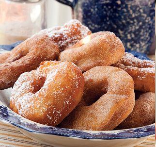 Let doughnuts rise, uncovered, about 30 minutes. In a deep saucepan, heat several inches of oil to 375 degrees. Fry doughnuts, a few at a time, until golden; drain. Sprinkle with cinnamon-sugar or powdered sugar.