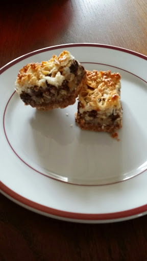 layers of pecans, chocolate chips, and coconut, IN THAT ORDER, PRESSING