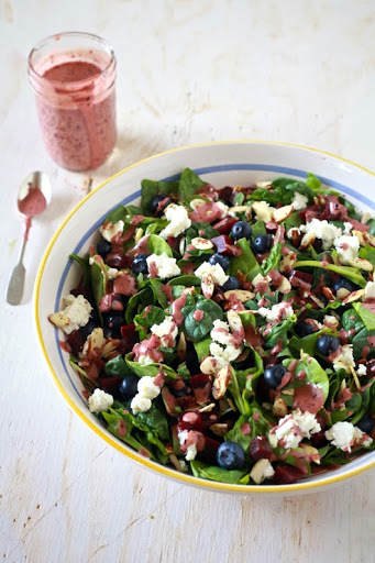 Being that it’s national vinegar month and all I want to eat is salad it’s time to talk salad and dressing it up. I adore pairing balsamic vinegar with blueberry, add some fresher crack pepper and you have a real winner. Pepper has a way of amplifying the flavor and sweetness of blueberries without being obnoxiously peppery. It’s kind of magical.