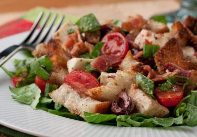 Toss together bread, olives, next 4 ingredients, and mozzarella mixture. Let stand 20 minutes. Serve over lettuce, and sprinkle with crumbled bacon.