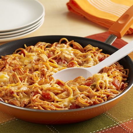Ready in only 30 minutes, this flavorful spaghetti gets a cheesy, chicken enchilada overhaul to switch things up.