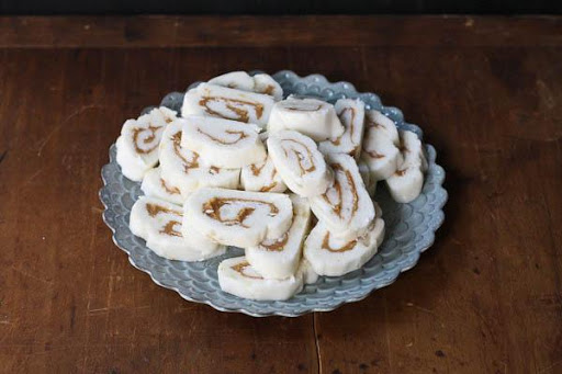 On a sheet of wax paper, and using your hands, flatten out one of the halves of dough into a rectangle. Cover the dough with a second sheet of wax paper and, using a rolling pin, roll the dough until it is roughly 13-14 inches long and 10 inches wide. Lift the wax paper and dough carefully, place on a baking sheet, and chill for about 5-10 minutes only. Remove from refrigerator and spread 1/4 cup peanut butter evenly onto the dough. From the long side, carefully roll into a log and wrap well in wax paper. Repeat with other half of dough. Chill the logs for at least 2 hours before slicing. Once chilled, slice into 1/2-inch pieces and serve.