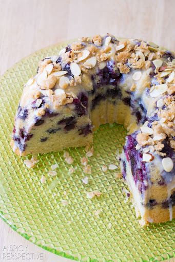 Pour the batter into the prepared bundt pan and sprinkle the remaining blueberries over the top. Bake for 60-80 minutes, until a toothpick inserted into the center comes out clean. Remove the cake from the oven and allow it to cool for at least 20 minutes before flipping out onto a cooling rack. DO NOT try flipping the cake any earlier than 20 minutes, or the cake will stick. Promise!