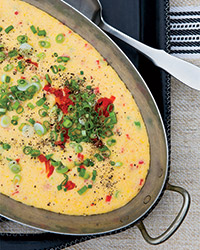 Remove the saucepan from the heat and whisk both cheddar cheeses into the grits along with the cream cheese, piquillo peppers and cayenne; season with salt and black pepper. Scrape the grits into a serving bowl, garnish with thinly sliced scallions and serve.