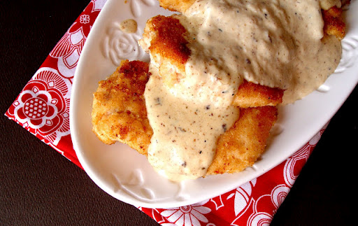6. Let your oil heat up just for 30 seconds or so, and then put the chicken carefully in the pan. Don't crowd it now. You'll need to cook the chicken in two batches.