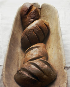 Transfer loaves to a baker's peel or rimless baking sheet that has been sprinkled with coarse cornmeal. Brush the top of the loaves with the egg white. Use a razor blade or serrated knife to make four diagonal cuts, 1/4 to 1/2 inch deep, across each loaf. Slide each loaf onto the baking stone. If not using a stone, bake loaves on a parchment-lined baking sheet that has been dusted with coarse cornmeal. Quickly pour 2 cups of very hot water into the heated baking pan to create steam. Bake until dark brown and hollow-sounding when tapped on the bottom, about 30 to 40 minutes. Let cool on a wire rack for at least 30 minutes before slicing.