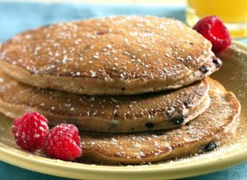Stir all ingredients except powdered sugar until blended. Pour by slightly less than 1/4 cupfuls onto hot griddle.