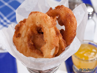 Dip onion rings into batter, coating well; fry, a few at a time, in hot oil until golden brown. Drain onion rings on paper towels. Serve immediately.