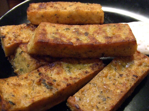 Heat the remaining oil in a skillet over medium high heat and cook the chickpea fries until they are browned and crispy on both sides, about 5 minutes per side. Transfer to a paper-towel lined dish or cooling rack and sprinkle with Kosher salt. Serve with your favorite dip.