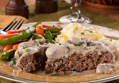 In a small bowl, combine mushroom soup, milk, and mushrooms; mix well and pour over patties. Reduce heat to medium-low, cover, and simmer 8 to 10 minutes, or until no pink remains in beef. Serve topped with mushroom sauce.
